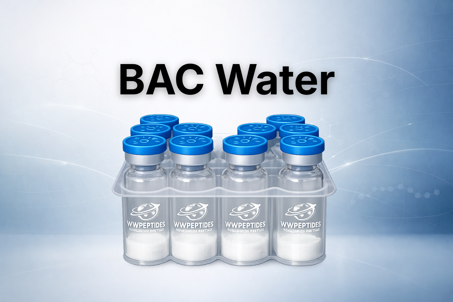 Lyophilized (freeze-dried) peptides must be dissolved in an aqueous vehicle before use. Bacteriostatic water is the standard choice for this purpose in peptide research for two reasons: it is sterile, eliminating endotoxin and particulate contamination risk, and the 0.9% benzyl alcohol preservative suppresses bacterial growth across repeated needle punctures of the same vial. Once a peptide is reconstituted in BAC water and stored at 2–8°C, the solution typically remains stable for 28–30 days — far longer than solutions prepared with plain sterile water, which offer no microbial growth suppression after the first puncture. The appropriate volume of BAC water to add depends on the desired working concentration: total peptide mass (mg) divided by volume added (mL) equals concentration (mg/mL). All product pages for WWP peptides include specific reconstitution examples.